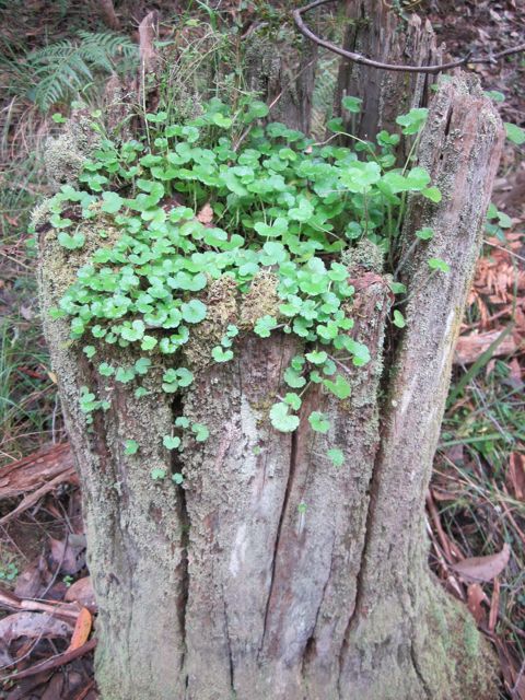 Walking along a waterway in Red Hill today I found a stump of a tree that was pretty old but it also had plants growing out of its centre. I think there was some kind of indigenous Geranium sp ground cover, moss, wire grass and Prickly Current bush.