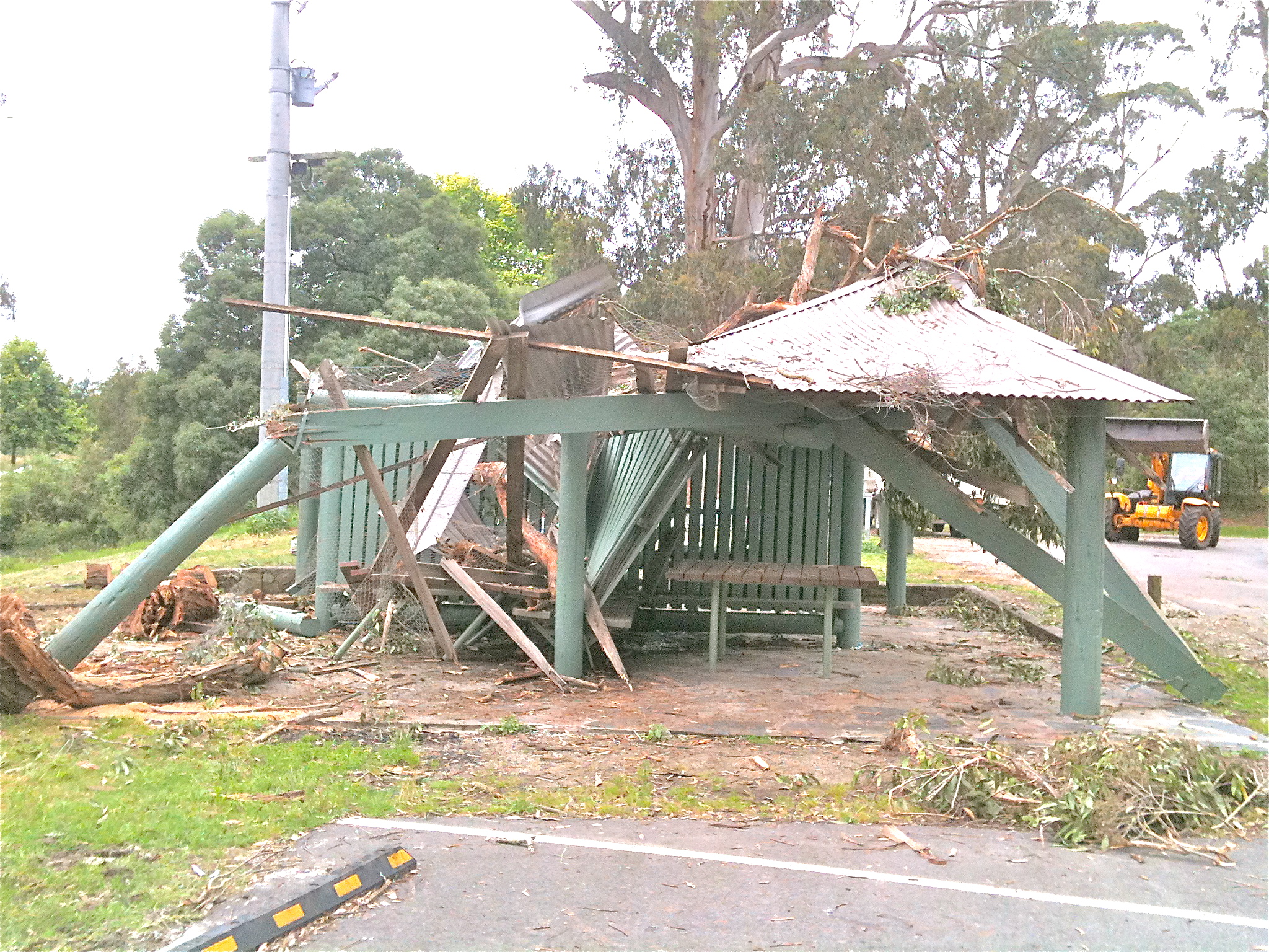 Sometimes, when driving in the Labertouche region, I drop into Picnic Point for a toilet stop. When I need to I get in under a picnic shelter to catch up on emails and/or do other things on the net but no more. In the last couple of days a tree has fallen onto the shelter and pretty much squashed it.
