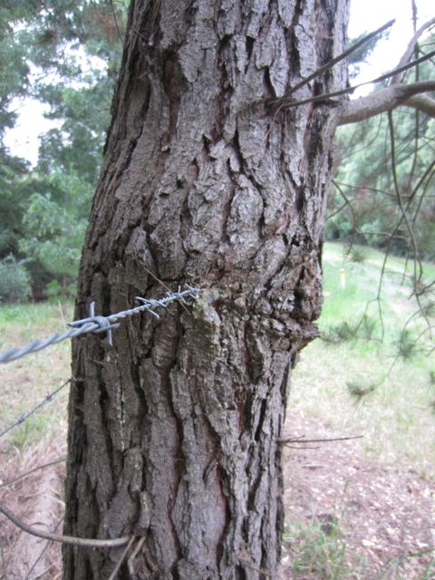 Farm fences and trees I visit many properties over a year but I’ve never seen this before. The top wire on a barb wire fence has been incorporated into a young Radiata pine tree. That is a very good fence post. Share this:TweetLike Loading... Related Bookmark the permalink.