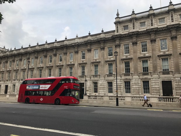 I love the drab sandstone bricks against the bright red bus.