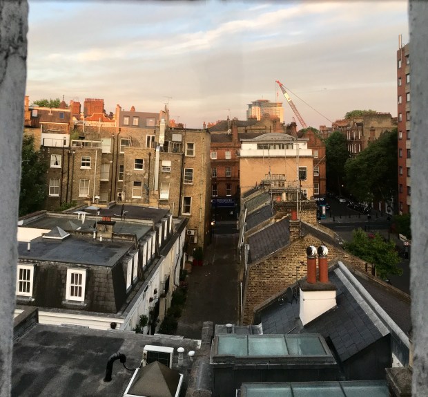 My last two nights at London finds me on the third floor of the Earl’s Court YHA. Above is the view from this morning around 6:00 am, panoramic using my iPhone, hence some of the buildings are on a slant. I think that’s the reason.