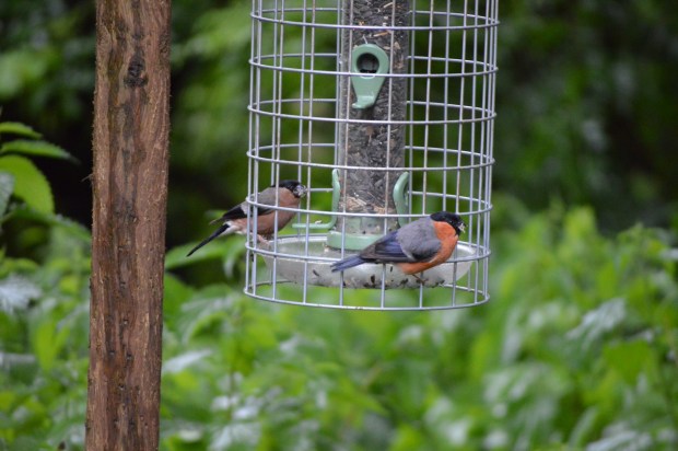 The English love feeding birds and a feeder is a great place to see new species . The cage is to keep Squirrels away from the food. The birds on the feeder are Bullfinch, (tick).